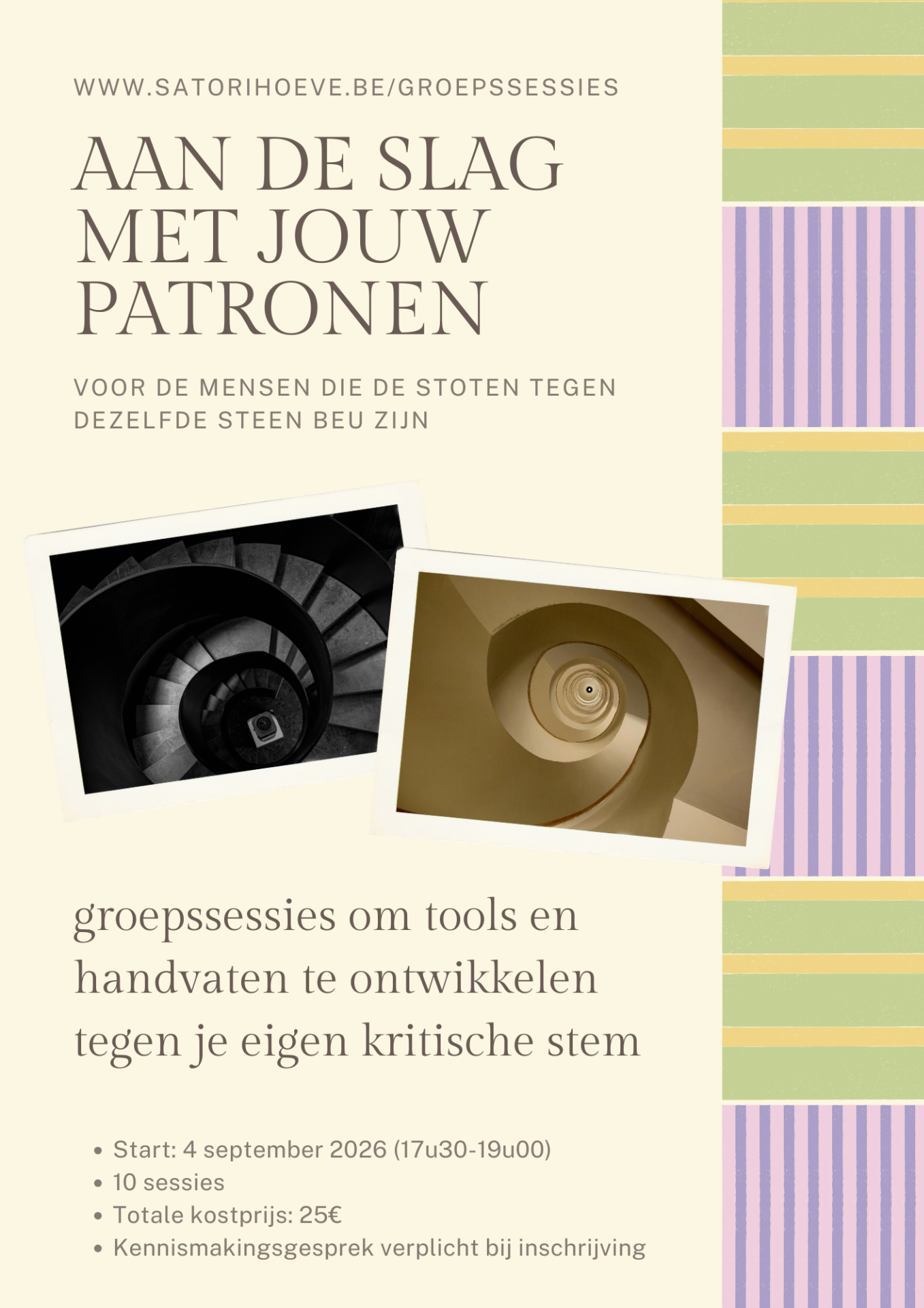 Sommige reacties, emoties of gedragingen lijken telkens terug te keren, ook al wil je het anders. In deze verdiepende groepssessies gaan we aan de slag met hardnekkige patronen die vaak al lang meespelen.